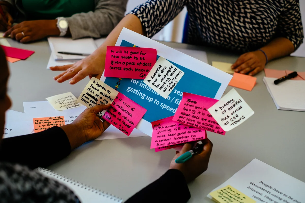 The first part was intended to gain alignment on the challenges facing the organisation, and diverge around potential solutions. I discussed the themes we had uncovered through 1 on 1 interviews and each theme was put up on the wall. Participants were invited to add their own thoughts which allowed us to enrich our findings and gain different perspectives. Then we went through each theme individually and generated a large number of potential solutions.