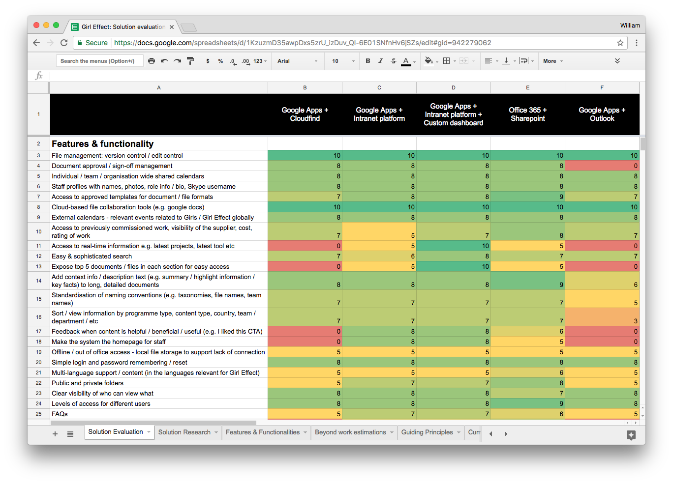Now that we had our list of requirements & system principles, we could begin the search for existing technologies/ products that could meet the needs of our users. We knew that building the entire product from scratch would be too costly and time consuming, so instead decided to evaluate products (or combinations of products) that were already available E.g. Google Apps + Papyrs (a simple off the shelf intranet tool).