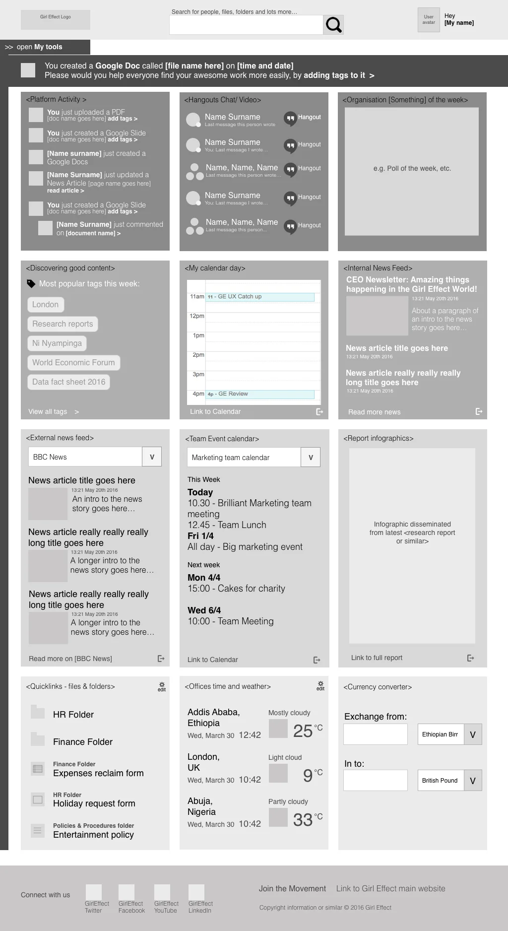 I begun sketching out some initial ideas for the dashboard while our tech team were busy investigating Papyrs and Google Apps For Work to enable them to determine flexibility & customisability. Their priority was investigating the APIs between the 2 products - as theses would determine which data-points we had at our disposal and be the main constraint on the experience.
