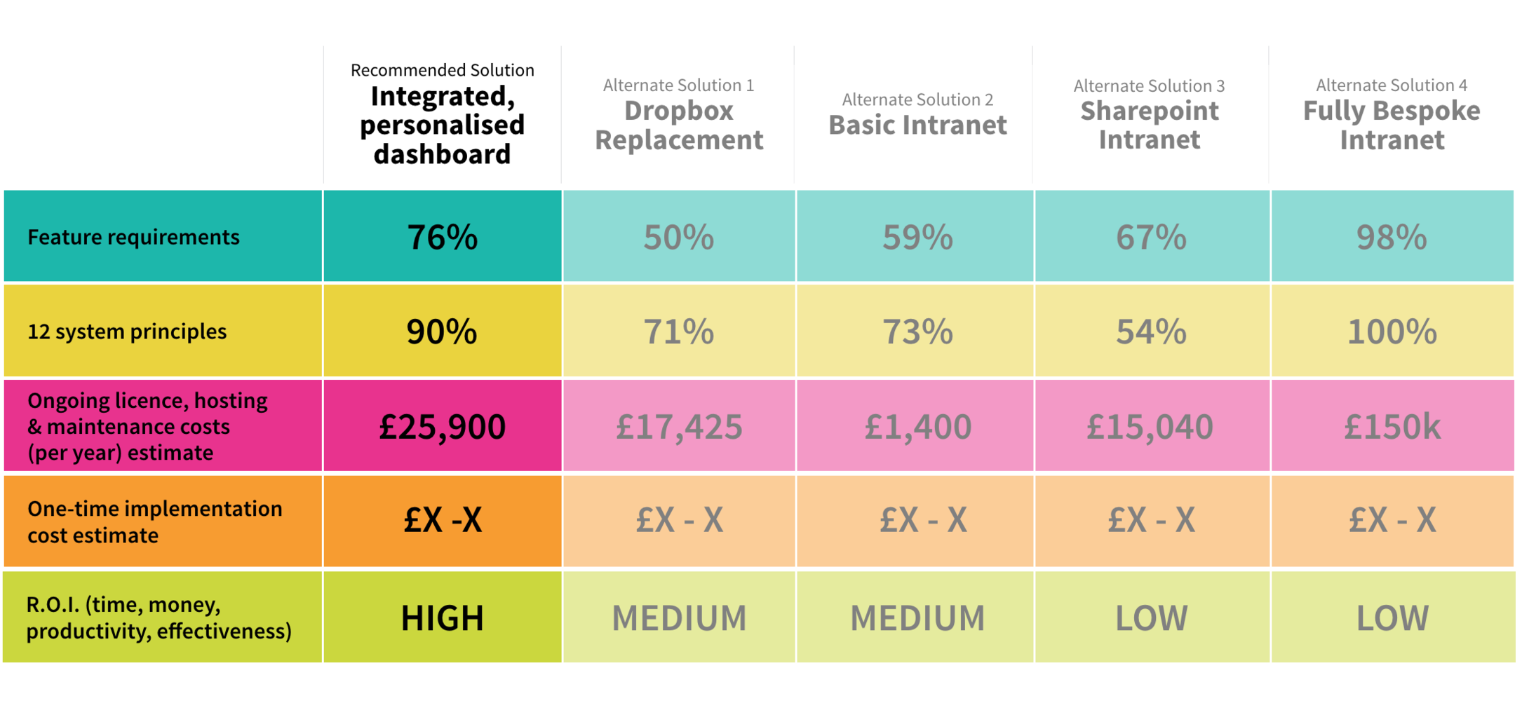 We also evaluated each solution against a set of system principles that we felt were important to staff & the organisation. Additionally we rated solutions for their ability to integrate with existing platforms, costs - one off and ongoing (hidden) and internal implementation effort. This allowed us to evaluate each solution thoroughly and put ballpark costs to each option.